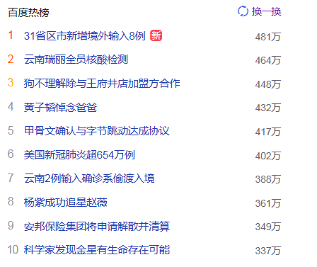 1. 31省區(qū)市新增境外輸入8例 獵頭熱點(diǎn)熱度481萬