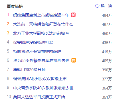 2.大選前一天特朗普和拜登在忙什么 獵頭熱度熱點(diǎn)467萬(wàn)