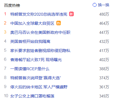 1. 特朗普發文稱2020總統選舉違憲 獵頭熱度熱點480萬