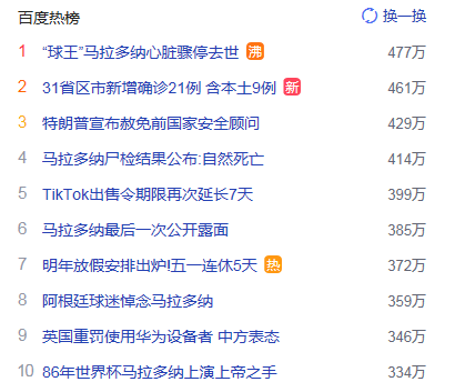 1. “球王”馬拉多納心臟驟停去世 獵頭熱度熱點477萬