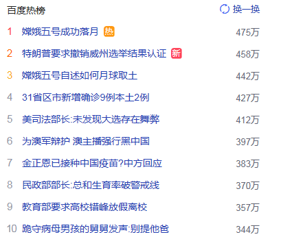 1. 嫦娥五號成功落月 獵頭熱度熱點475萬