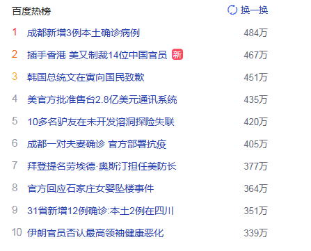 1. 成都新增3例本土確診病例 獵頭熱度熱點(diǎn)484萬