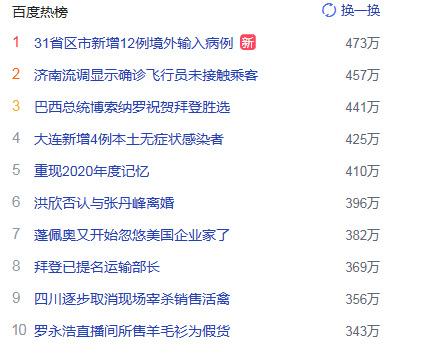 3. 巴西總統(tǒng)博索納羅祝賀拜登勝選 獵頭熱度熱點(diǎn)441萬